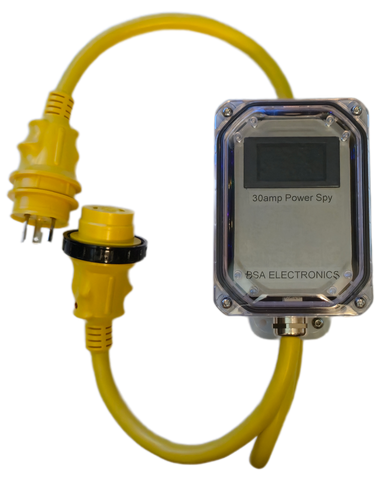 The Power Spy™ #33 30A 120v Outdoor power monitor allows you to monitor your L5-30 outlet's energy usage on the boat dock or anywhere else.  Now you can see exactly how much your Boat or anything else equipped with an NEMA L5-30 plug is using for power. The beautiful four color meter tells you instantly what your line voltage is, your amperage draw is, your wattage draw is, and it even accumulates kilowatt-hours (kWh's). You can multiply the kilowatt-hours by your local electrical rate to see how many dollars and cents it cost to run your particular device. We pay approximately $0.125 per kWh here in Las Vegas.  The total is accumulated until you press the recessed reset button underneath the removable polycarbonate window. The total is even held during power outages. This model is equipped with stainless steel tamper resistant screws threaded in to brass inserts. Build from a high quality Polycarbonate case for maximum strength and durability. This is a great solution to monitor the energy usage of boats in a Marina. This unit is built with marine grade molded on L5-30 connectors. The Power Spy™ #33 is built with the power input cord clamped to the rear as shown so it can hang below the wall outlet. Great for use anywhere you need to keep track of power usage! The Power Input cord is offered in several lengths, the Power Output cord is on a 1' tail