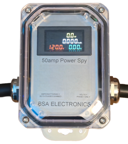 New: I now offer this Power Spy™ in your choice of configuration to save money without the yellow weather boots (not for Marine environments and the like) and with only a single meter. When configured with a single meter the AMPS/WATTS/KWH from each 120volt phase are added together and the VOLTS are read from Phase 1 only. Running the single meter at 120volts allows the meter to do the math correctly for the AMPS/WATTS/KWH.