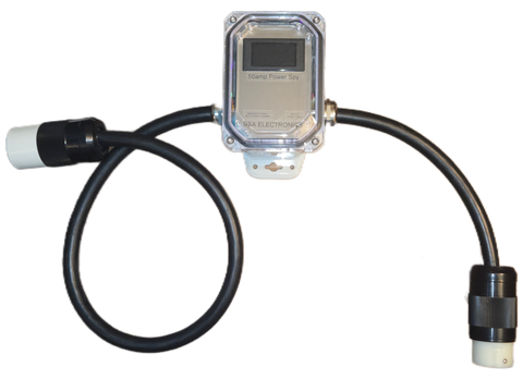 The Power Spy™ #31 50A 240v Outdoor allows you to monitor your NEMA SS2-50R outlet (marine model number) and CS6364 outlet's (food truck and other portable use model number) energy usage on the boat dock or anywhere else. Now you can see exactly how much your Boat or anything else equipped with an SS2-50P or CS6365 plug is using for power. The beautiful four color meters tell you instantly what your individual line voltage is, your amperage draw is, your wattage draw is, and it even accumulates kilowatt-hours (kWh's). Each meter runs at 120 volts and reads one Phase. This unit was specifically designed as a great solution to monitor the energy usage of boats in a Marina. You can multiply the kilowatt-hours by your local electrical rate to see how many dollars and cents it costs to run your particular device. We pay approximately $0.14 per kWh here in Las Vegas. The totals are accumulated until you press the recessed reset buttons underneath the removable polycarbonate window. The total is even held during power outages. This model's window has a heavy weather seal and is equipped with stainless steel tamper resistant screws threaded into brass inserts for easy repeat removal. Built from a high quality Polycarbonate case for maximum strength and durability. This unit is built with genuine Marinco connectors with matching Marinco yellow weather boots utilizing a CS6365 plug and one CS6364 outlet. These work with marine shore power cables that utilize the SS2-50 connectors (120/240v 50amp) Great for use at Fair Grounds, Commercial buildings, RV Parks, Boat Marinas, anywhere you need to keep track of power usage! The Power Input cord is offered in several lengths, the Power Output cord is on a 1' tail. Compact body at only 6.4 x 4.4 x 4.3 inches. I can certainly customize the lengths for you, just email me and I am happy to give you a quote.